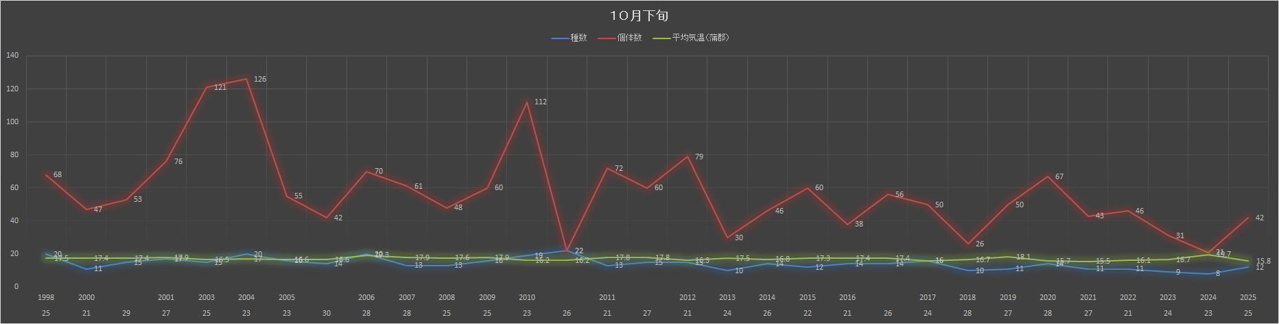 ヒヨドリの個体数が多い。ホオジロとシジュウカラで囀り個体を確認。茶臼山や三河湖でも同様。先週からジョウビタキの声を聞くようになった。室林道でも本日メスを見る。シカの遠吠えやアサギマダラも秋を感じさせるものだ。