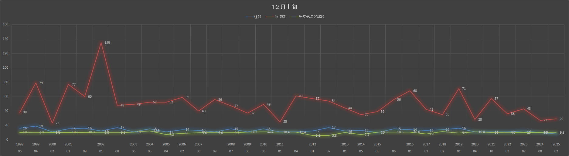 温暖な気候が野鳥にどのような影響を与えているのか、今のところは記録的な暖かさが続いており観察には絶好の年といえる。一冬終えた後の結果に興味がある。ヒガラは記録的に個体数が多い。なにしろ、10月からずーっとヒガラの観察記録が途切れていないのだ。最初は、観察したの移動中の個体であっていずれ室林道からはヒガラの姿は消えるのでは、と予想をしていたのだが。予想は見事に外れてしまった。