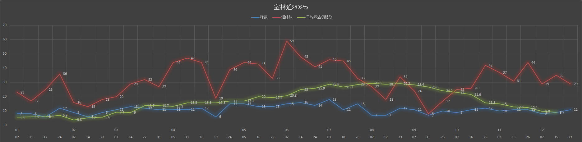 | センダイムシクイ | Phylloscopus coronatus | 2 | 8 | 5 | 5 | 5 | 3 | 1 | 4 | 3 | 2 | 3 | 3 | 44 | |||||||||||||||||||||||||||||||