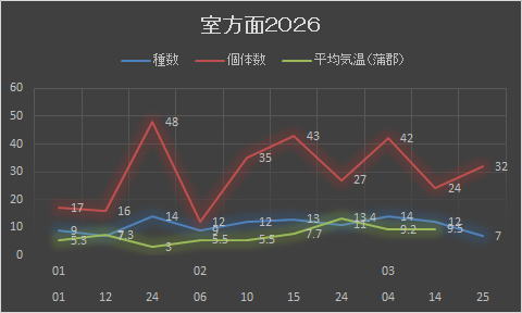 | ウグイス | ウグイス | ウグイス | Cettia diphone | 1 | 1 | 1 | 1 | 1 | 1 | 1 | 5 | 4 | 9 | 25 | |