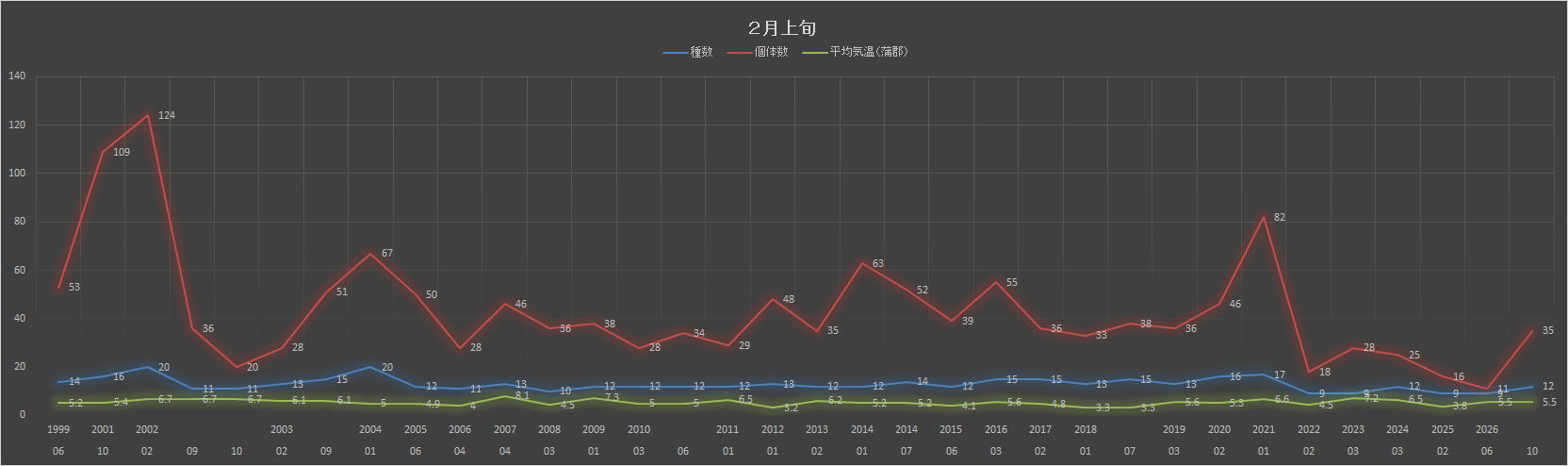 月半ばから暖かい日が続いている。これでは春先の陽気だ。冬鳥はほとんど見ない。そのかわりにさえずりをする鳥が増えてきた。シジュウカラ、ヤマガラ、ホオジロなど。このまま春に入ってしまうのだろうか。日本でも、部分部分ではかなり低温になっているようであるし、北米はものすごい寒さである。しばらくは天気予報と野鳥のようすに目が離せない。