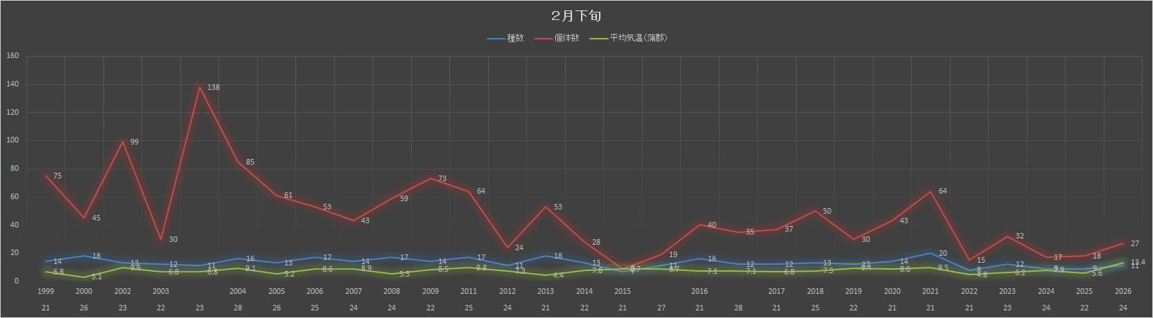 個体数が少ない。2月下旬で2日間センサスを行なったけれども、両日とも過去に比べ種数・個体数は小さかった。