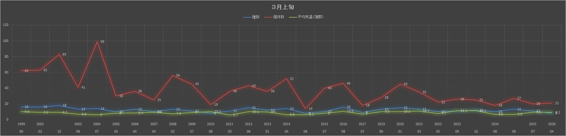 今年は比較的暖かい冬であった。野鳥のさえずりも早いようだ。ウグイスのさえずり個体も多い。そのかわり、冬鳥は少なかったようだ。