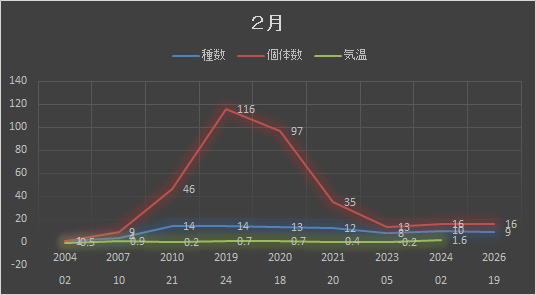 | シジュウカラ | シジュウカラ | Parus minor | 1 | 3 | 1 | 1 | 2 | 2 | 2 | 1 | 1 | 2 | 16 | |||||||||||