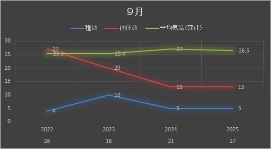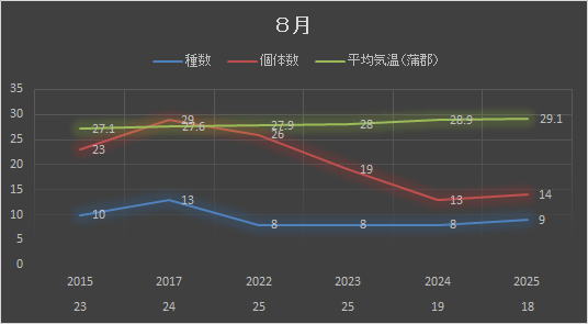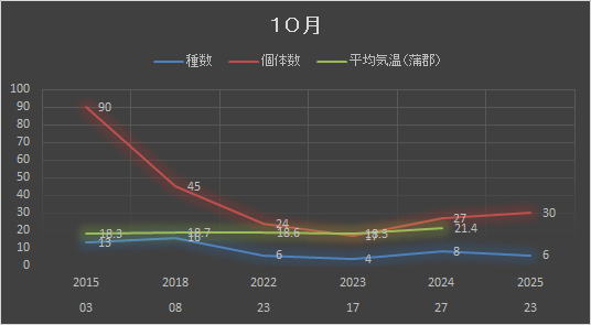 | 目名 | 科名(亜科) | 属名 | 種名 | 学名 | 07 | 24 | 28 | 10 | 09 | 22 | 28 | 29 | |