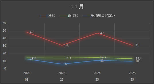 | メジロ | メジロ | メジロ | Zosterops japonico | 25 | 10 | 12 | 3 | 4 | 16 | 70 | ||