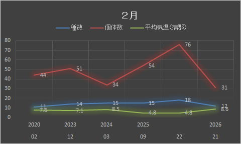 | ウグイス | ウグイス | ウグイス | Cettia diphone | 5 | 3 | 1 | 1 | 2 | 1 | 1 | 14 | ||