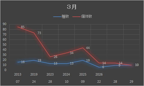 | アカゲラ | コゲラ | Dendrocopos kizuki | 1 | 2 | 3 | 4 | 2 | 1 | 13 | ||||