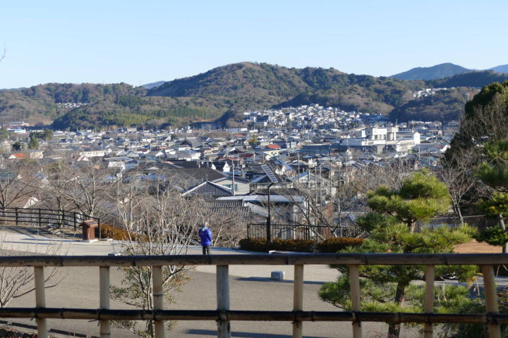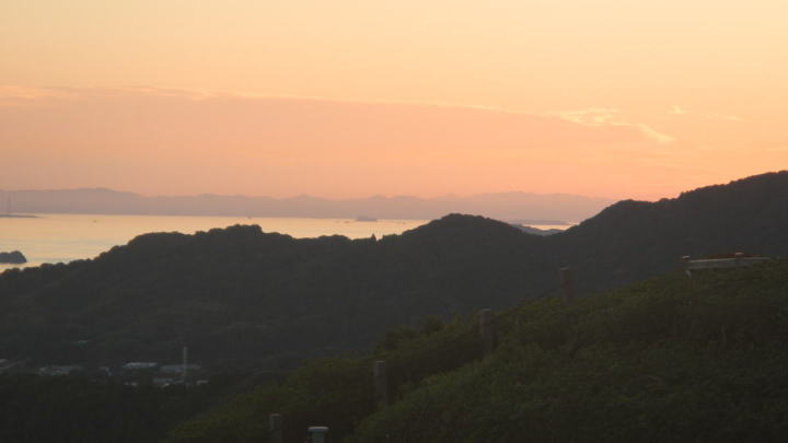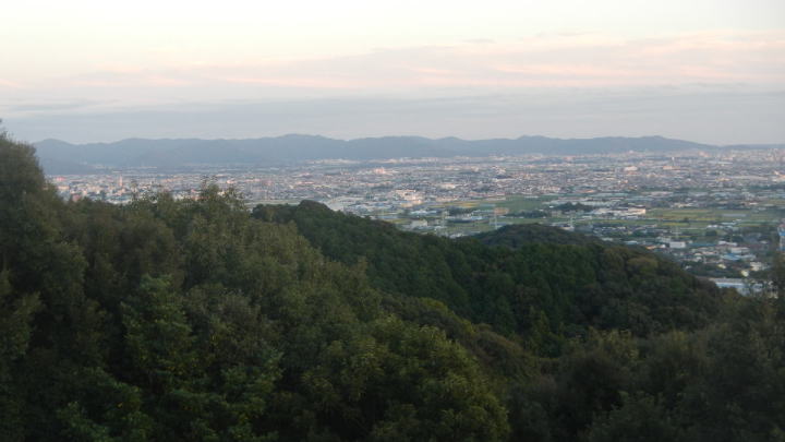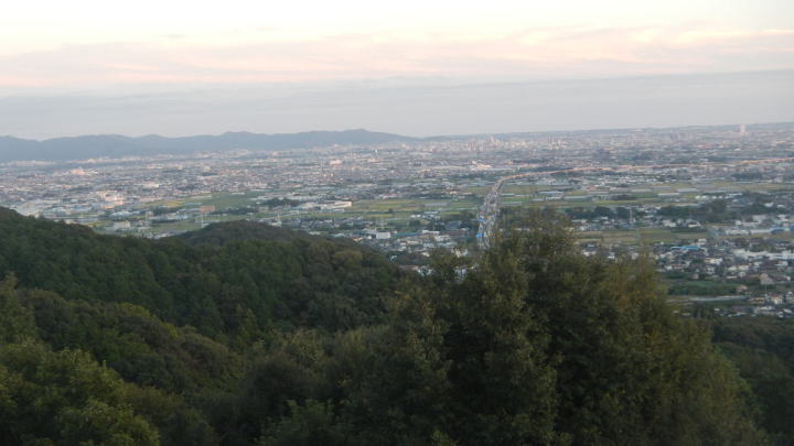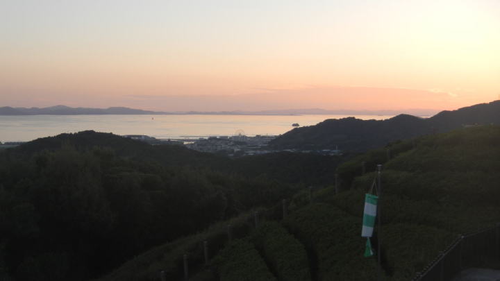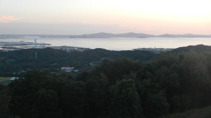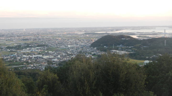 夕日が柔らかく注ぐ、展望台からの三河平野、三河湾の眺め。