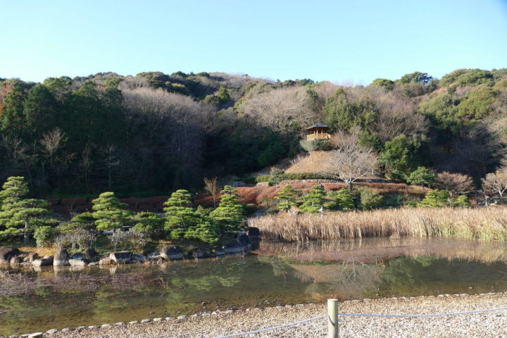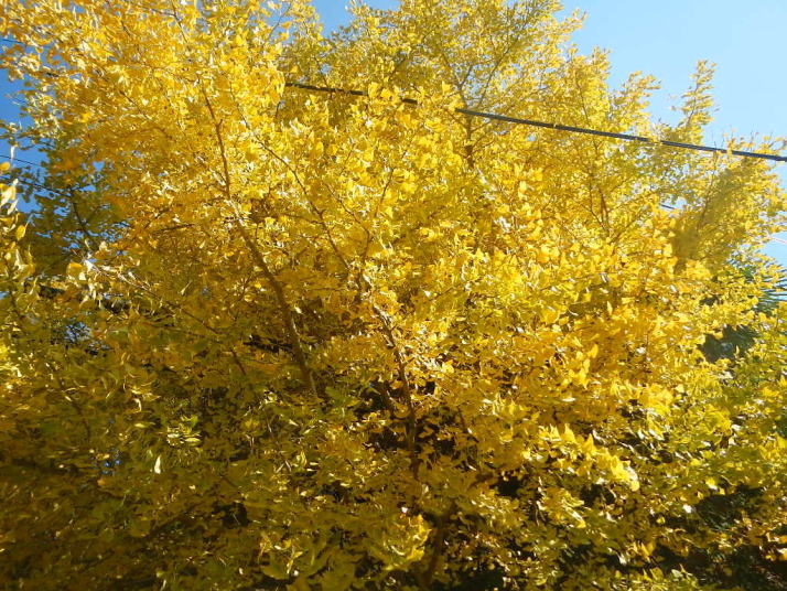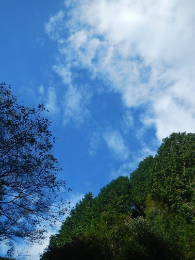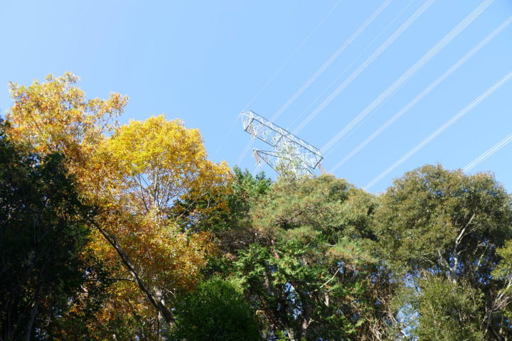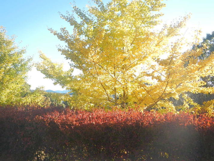 冬とは思えない穏やかな天気、青空、紅葉の山、飛ぶ鳥、鳴く鳥。