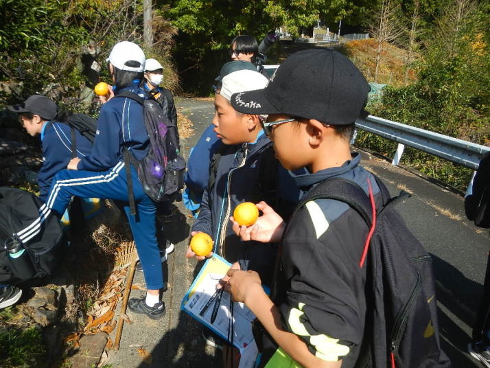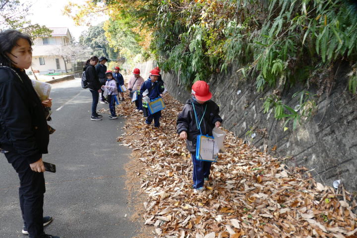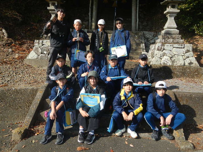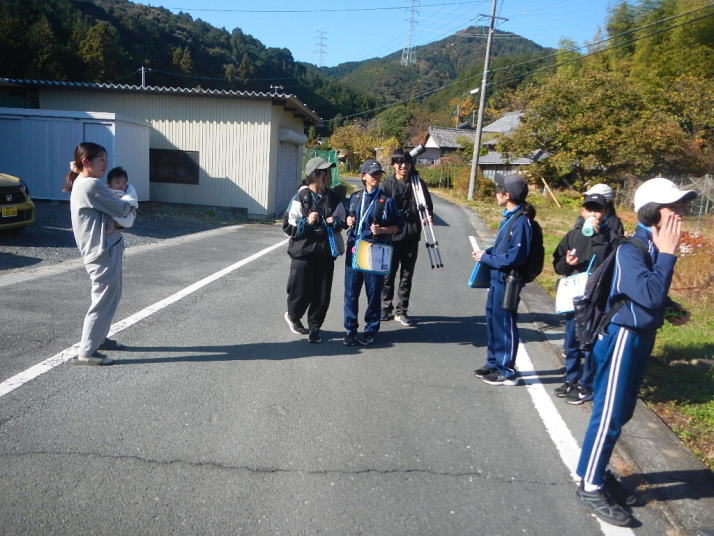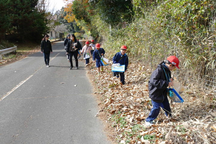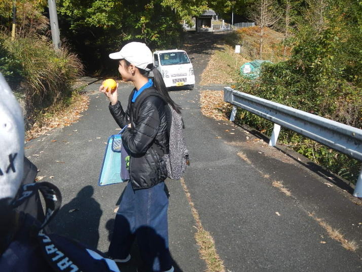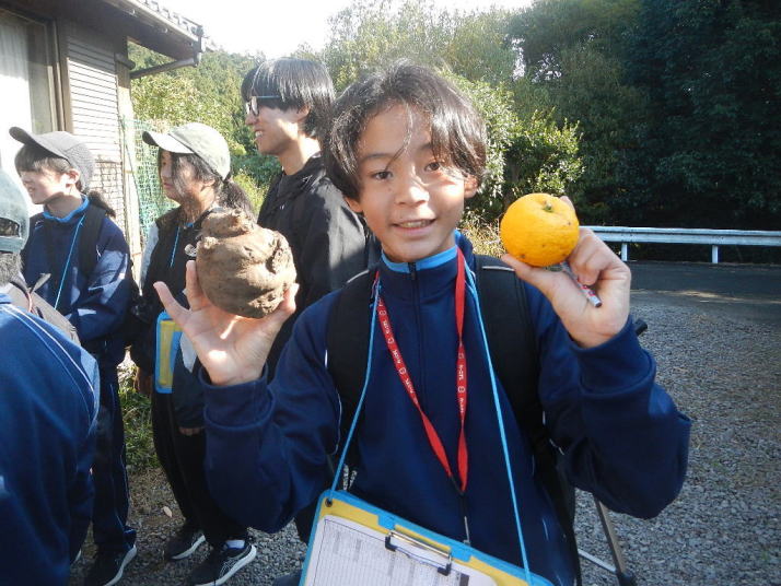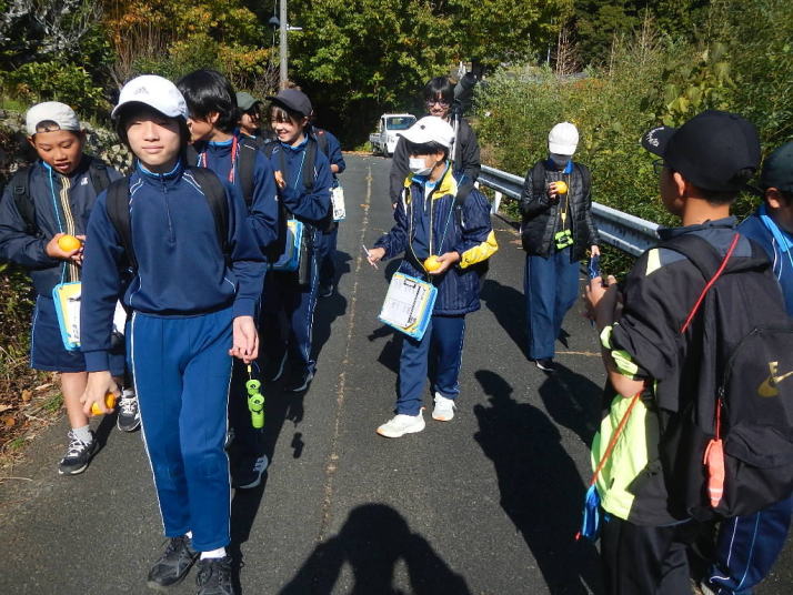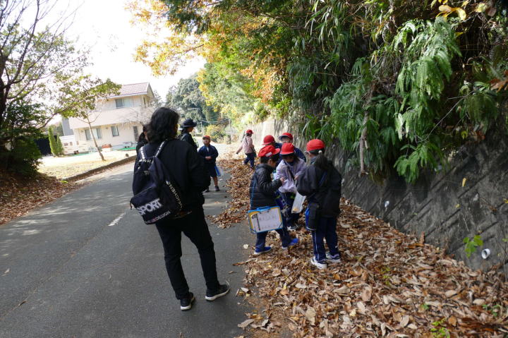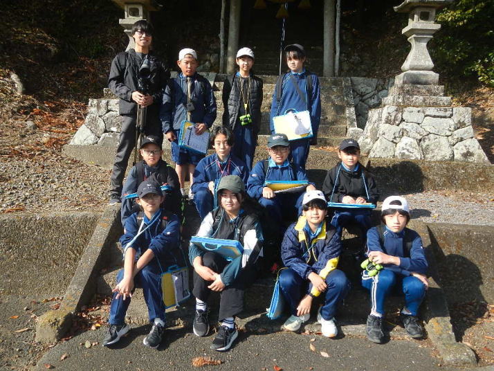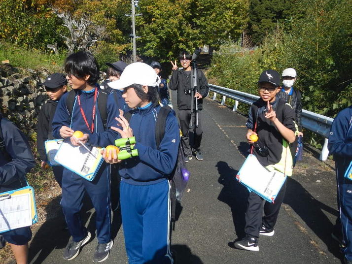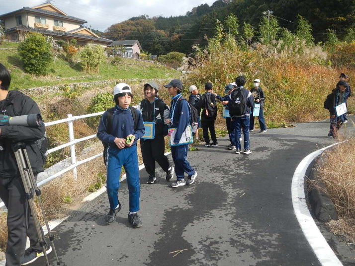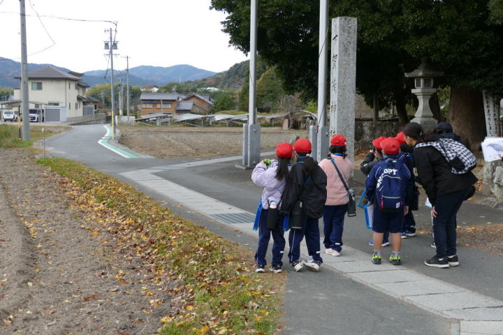 曇り空がみるみる青空へと変わっていく。その空にはトビ20羽以上が竜巻のように上昇していく。何らかの行動であることには間違いない。学校を出発して様々な鳥の声を聴く。ヒヨドリ、ハシボソガラス、ノスリの声が聴こえる。そこで、先のトビの群れを見たのだった。畑にある樹の中で珍しい小鳥を見た。ビンズイだ。少し前に見た鳥ではあるが、同じ仲間のタヒバリよりも個体数は少なく、偶にしか出会えない鳥なのだ。児童たちも姿を見つけた。室川に向かう切通しでカワセミの巣らしき穴を見つけた。子どもたちにも見てもらう。水平に開けられた穴が下に向かっているのが見て取れる。カワセミの巣の特長だ。川沿いに歩くと、草むらからホオジロが飛び立つ。つがいのような2羽も見られた。カワセミを探して室川添いに歩く。熊野社が見える。せっかくなのでお参りをする。帰路では地元の人たちとの交流タイムが。柚子を収穫している。「持って行きな」と言ってくれたので、手に手に柚子を持って歩く。後ほど先生から、体調を崩して参加できなかった児童のことを聞いた。そして、会ったら声を掛けてくださいとも。その時は、分かりましたと答えておいた。それが思わぬことでそれを実行することができた。詳しいことは省くが、体調は戻ったか聞いたところ、大丈夫と答えてくれた。ホッともしたし、会話ができて良かったと思っている。