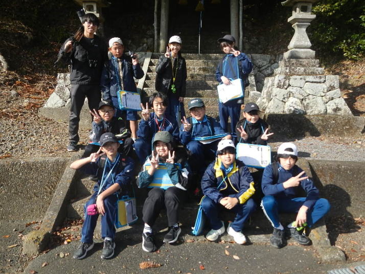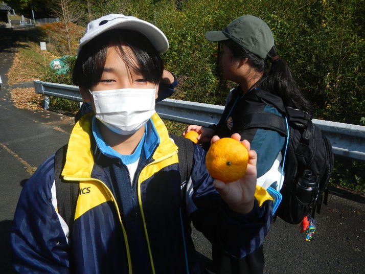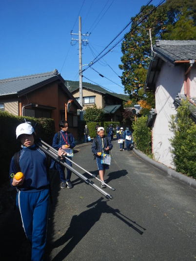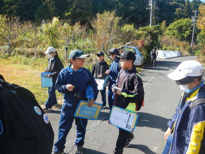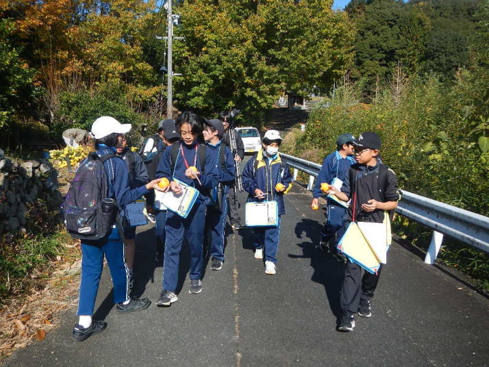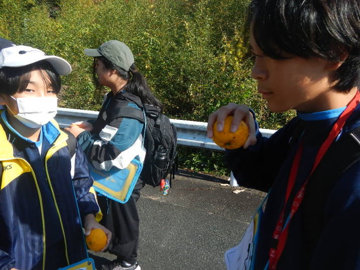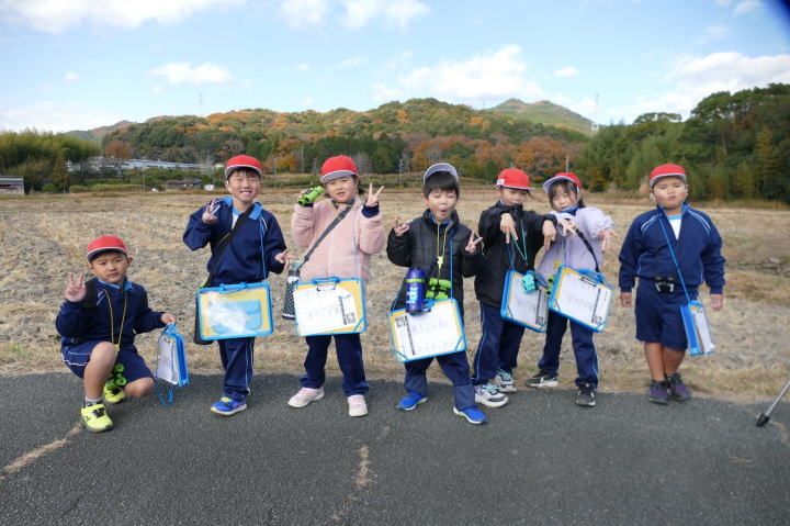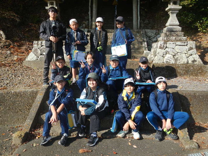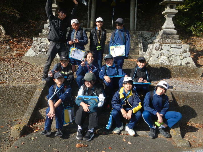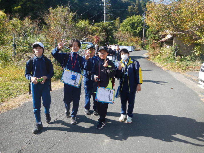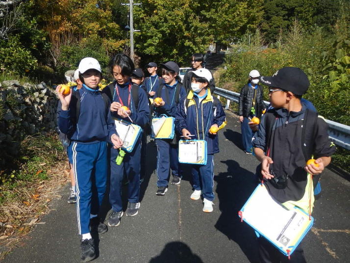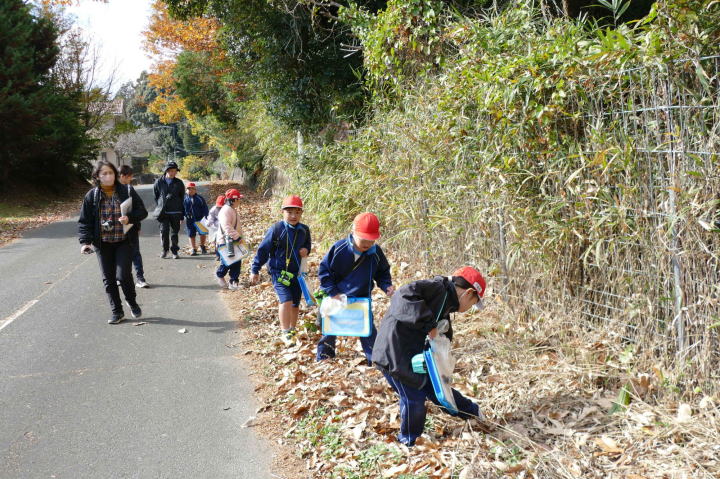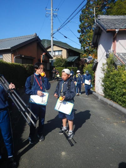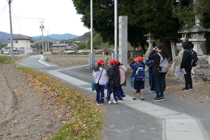 曇り空がみるみる青空へと変わっていく。その空にはトビ20羽以上が竜巻のように上昇していく。何らかの行動であることには間違いない。学校を出発して様々な鳥の声を聴く。ヒヨドリ、ハシボソガラス、ノスリの声が聴こえる。そこで、先のトビの群れを見たのだった。畑にある樹の中で珍しい小鳥を見た。ビンズイだ。少し前に見た鳥ではあるが、同じ仲間のタヒバリよりも個体数は少なく、偶にしか出会えない鳥なのだ。児童たちも姿を見つけた。室川に向かう切通しでカワセミの巣らしき穴を見つけた。子どもたちにも見てもらう。水平に開けられた穴が下に向かっているのが見て取れる。カワセミの巣の特長だ。川沿いに歩くと、草むらからホオジロが飛び立つ。つがいのような2羽も見られた。カワセミを探して室川添いに歩く。熊野社が見える。せっかくなのでお参りをする。帰路では地元の人たちとの交流タイムが。柚子を収穫している。「持って行きな」と言ってくれたので、手に手に柚子を持って歩く。後ほど先生から、体調を崩して参加できなかった児童のことを聞いた。そして、会ったら声を掛けてくださいとも。その時は、分かりましたと答えておいた。それが思わぬことでそれを実行することができた。詳しいことは省くが、体調は戻ったか聞いたところ、大丈夫と答えてくれた。ホッともしたし、会話ができて良かったと思っている。