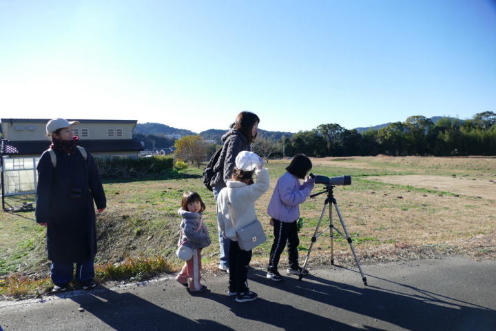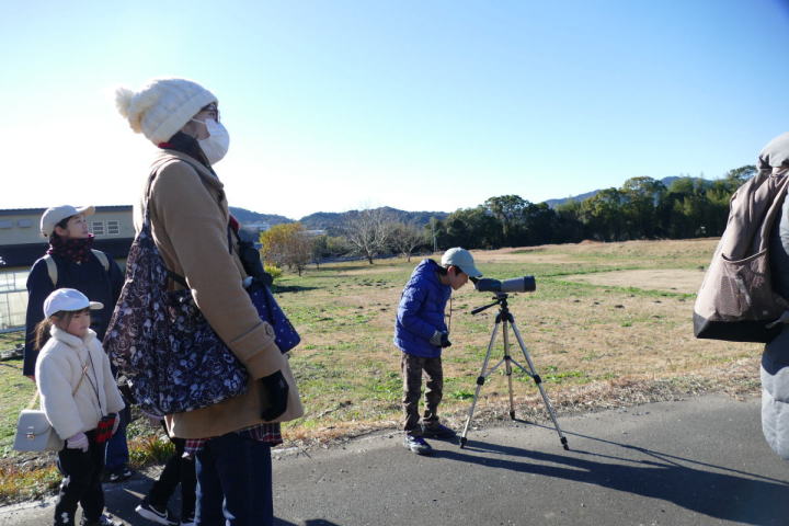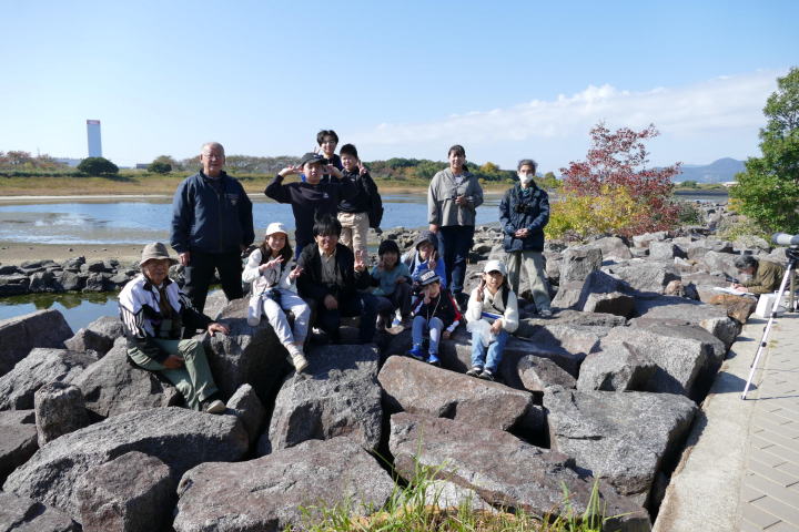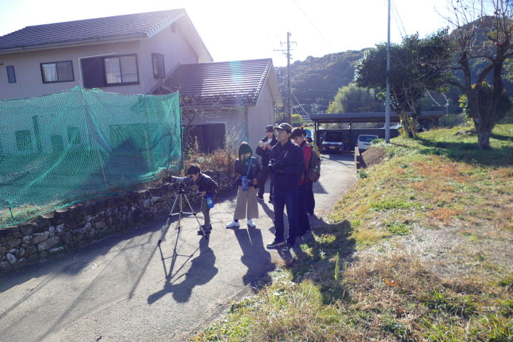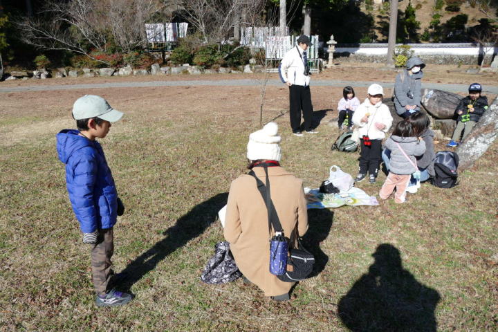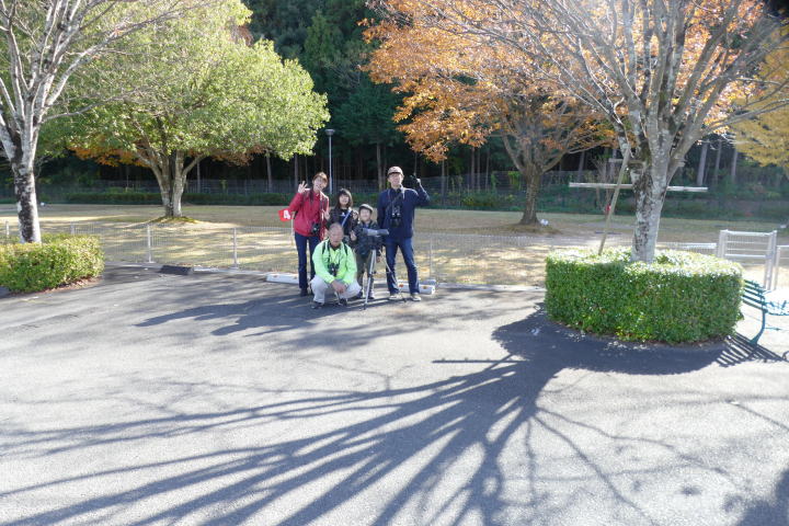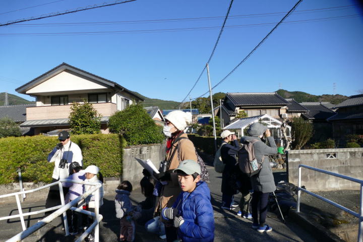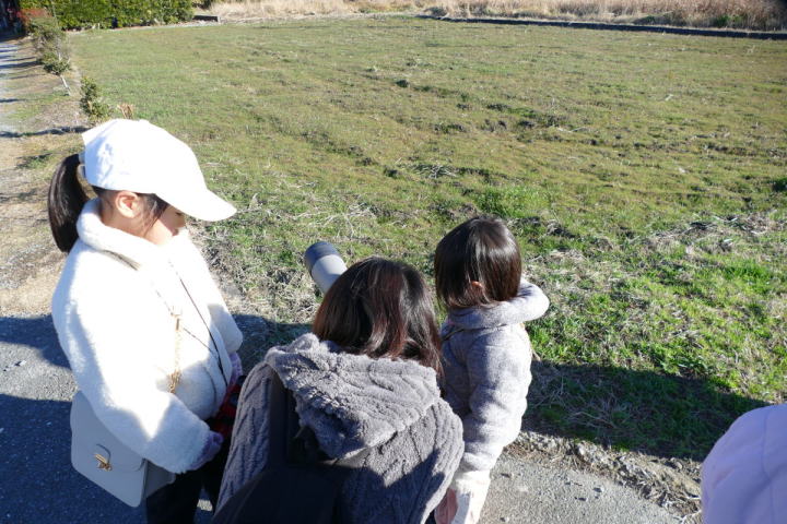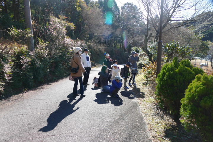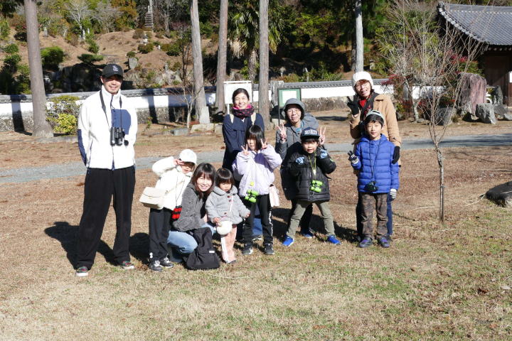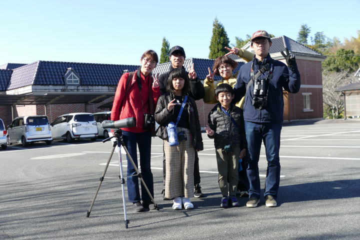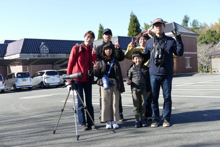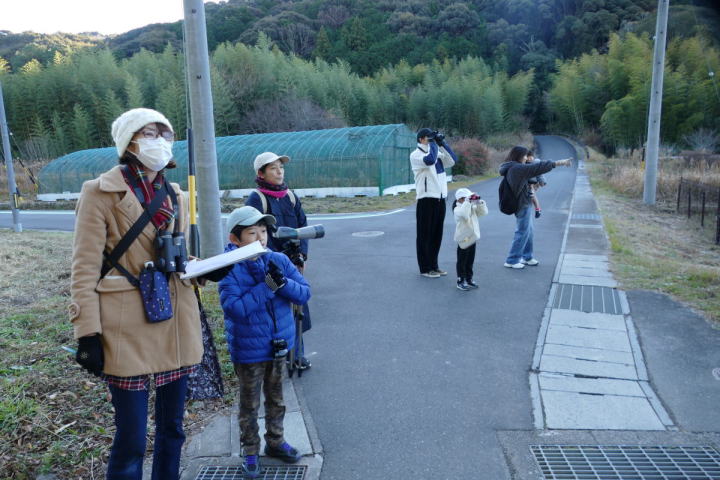 先生とご両親、本人とお姉さん、そして私、おとな5人こども2人で観音山方面の道を歩いた。坂道を登っていくと、ヒヨドリが沢山樹の中から鳴いている。周りから樹の中に飛び込む姿も見える。ジョウビタキがきれい、ハシボソガラスが大きい、ノスリがかっこいい、などと反応してくれるのはやっていてやりがいがある。山陰川ではカワセミの声を確認。田んぼではハクセキレイとセグロセキレイ。千鳥川に架かる橋の上で一休み。皆でお菓子を食べた。そろそろ学校に帰る時間。ジャルダンリラの中で記念写真を撮る。そして、橋の所までやって来た。念のために橋から川を眺めることにした。カルガモが見られるくらいに思っていた。ところがカルガモも確かにいたが、その近くにいたのは、大きな石の上にちょこんと止まるカワセミの姿であった。橋の欄干で望遠鏡をうまくカワセミに向けられない。三脚を伸ばして欄干が邪魔しない位置からカワセミを見たのだ。しかし、子どもの背では望遠鏡をのぞけない。大人が子どもを抱き上げて解決した。結果的には親子のコミュニケーションも取れた。11時50分に学校に戻った。たくさんの鳥が見られて楽しかった、と姉弟は感想を言ってくれた。