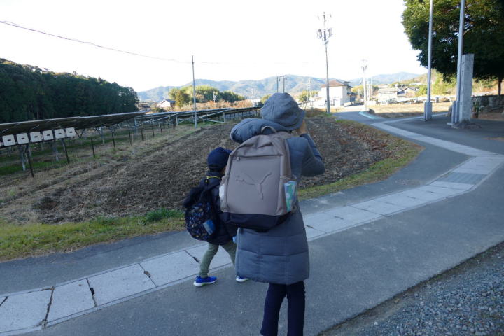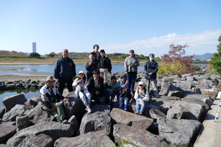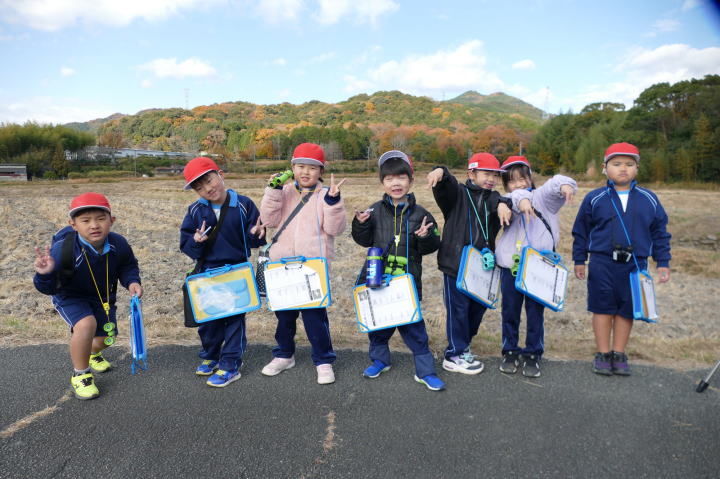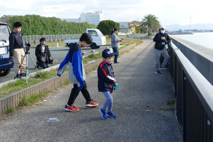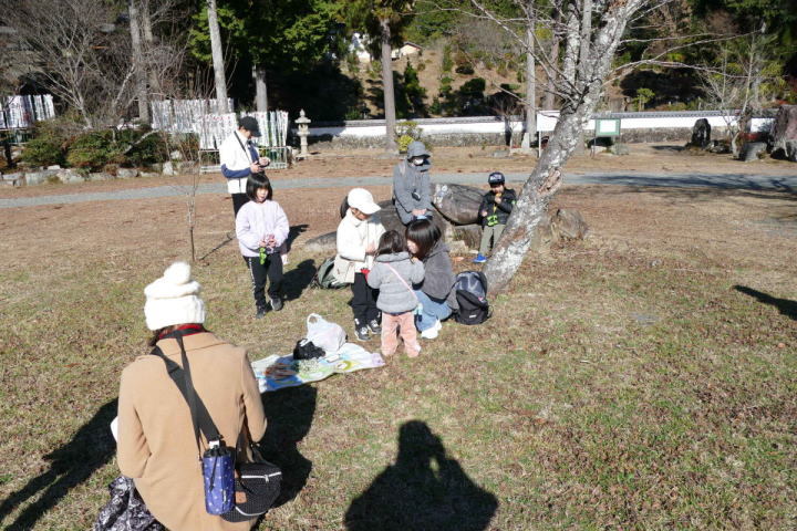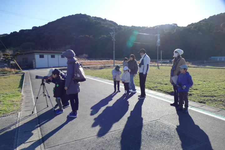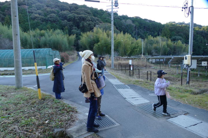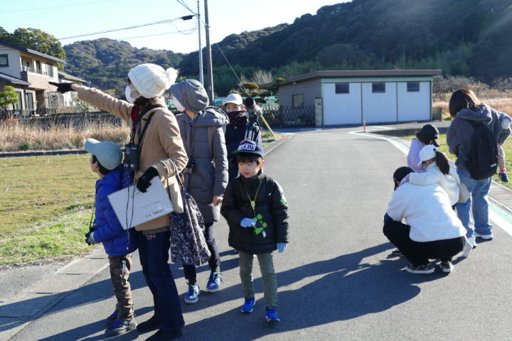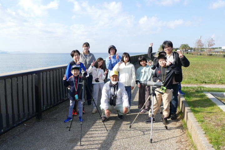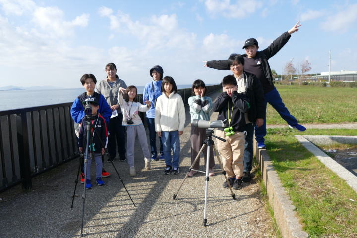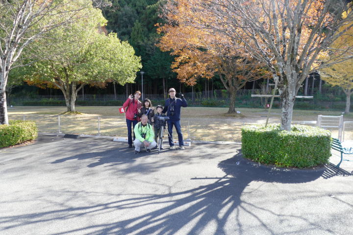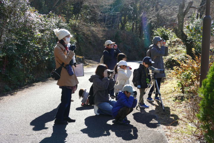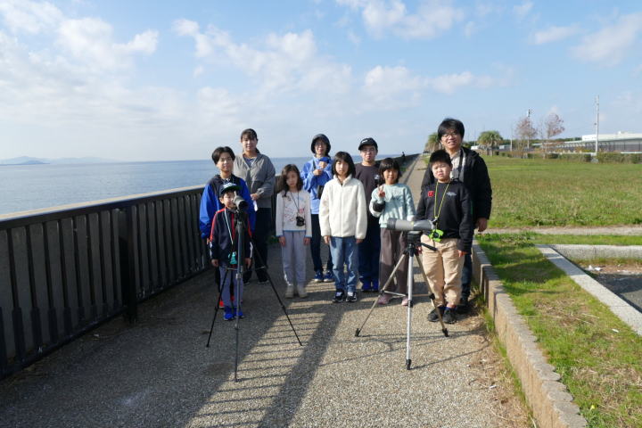 先生とご両親、本人とお姉さん、そして私、おとな5人こども2人で観音山方面の道を歩いた。坂道を登っていくと、ヒヨドリが沢山樹の中から鳴いている。周りから樹の中に飛び込む姿も見える。ジョウビタキがきれい、ハシボソガラスが大きい、ノスリがかっこいい、などと反応してくれるのはやっていてやりがいがある。山陰川ではカワセミの声を確認。田んぼではハクセキレイとセグロセキレイ。千鳥川に架かる橋の上で一休み。皆でお菓子を食べた。そろそろ学校に帰る時間。ジャルダンリラの中で記念写真を撮る。そして、橋の所までやって来た。念のために橋から川を眺めることにした。カルガモが見られるくらいに思っていた。ところがカルガモも確かにいたが、その近くにいたのは、大きな石の上にちょこんと止まるカワセミの姿であった。橋の欄干で望遠鏡をうまくカワセミに向けられない。三脚を伸ばして欄干が邪魔しない位置からカワセミを見たのだ。しかし、子どもの背では望遠鏡をのぞけない。大人が子どもを抱き上げて解決した。結果的には親子のコミュニケーションも取れた。11時50分に学校に戻った。たくさんの鳥が見られて楽しかった、と姉弟は感想を言ってくれた。