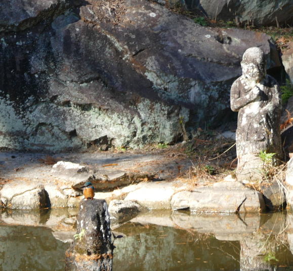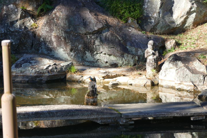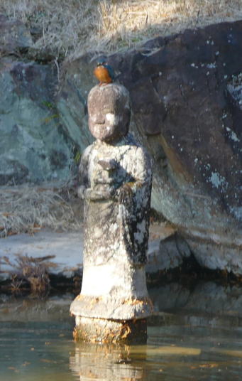 寒いような温かいような、自分のいる場所で大きく変化する不思議な日であった。まだ太陽の低い萩小校庭に集まったのは、大人6人、子ども5人。予定を大幅に超える。最年少は2歳。参加者最年少記録を大幅に超えてしまった。スタートでは寒そうにしていた子どもたち、正直心配したが、終わってみればニコニコ顔で学校に戻って来たのは良かった。お宮の横の田んぼにアルビノのセグロセキレイを見た。1年生の探鳥会を思い起こさせる。ここが気に入っているのかな。大変目立つので、行動範囲、年齢、その他もろもろ、しっかり見守っていきたいと思う。羽根の田んぼは騒がしい。ブルドーザが行ったり来たり。土地改良をしている。大きな田んぼに生まれ変わろうとしている。だから野鳥も寄り付かない感じだ。次に室へ向かった。近くにお寺(龍源寺)があるのでそこに行ってみた。トイレをお借りし、ヤギ小屋を見せていただく。ヤギを見ることはあまりないと思うので、そこから動こうとしない。ヤギのほうも、子どもの顔をしげしげと見ている。「いつも見る(お寺の子)顔と違うな。」と思っているのであろうか。お礼をして帰ろうとしていた時、モグモグタイムで頭がいっぱいになっていた時に、みんなが立ち止まっている。走って戻ると、「カワセミ」と言っている。庭園の池にカワセミがいたのだった。うまい具合に、仏様の頭に留まったり、池の周りを歩いたり、もう十分すぎるほど姿を見させてもらった。こんなことは滅多にないことだ。第1発見者の先生は、「萩に来て初めて見るカワセミ!」と笑顔でおっしゃった。良かったと思う。アルビノとカワセミ。今年最後は豪華な顔ぶれであった。