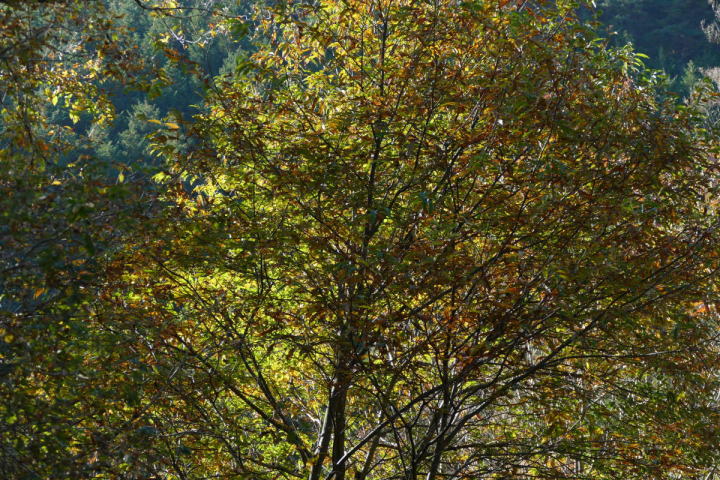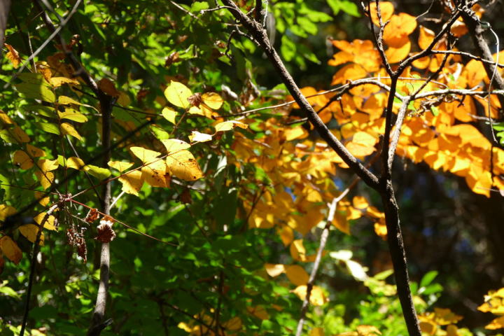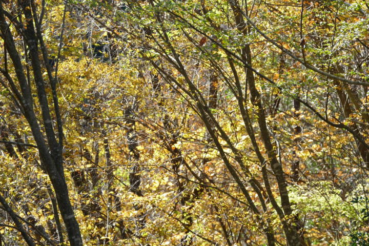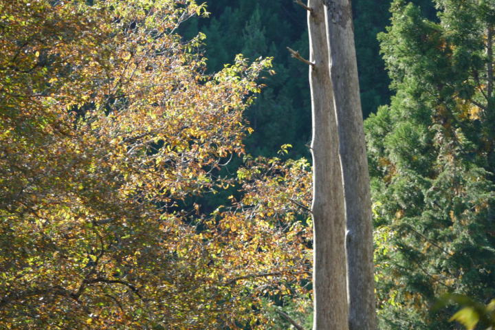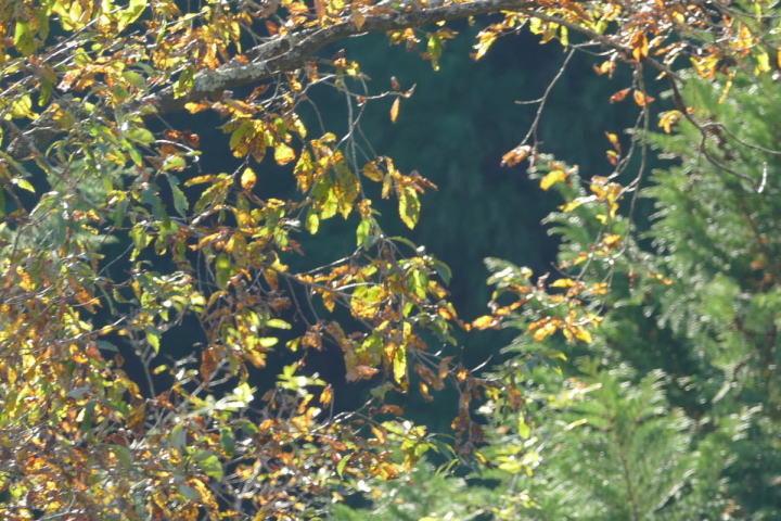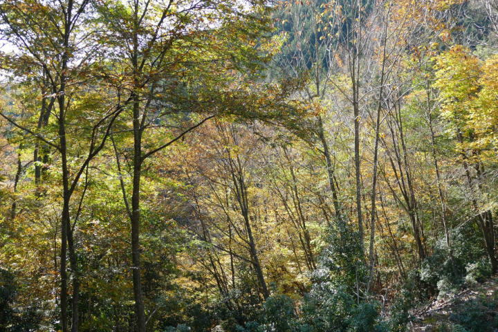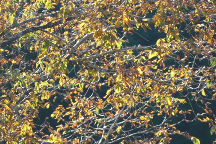 室林道を終えて、さらに欲張り三河湖にまで足を延ばした。なんだか歩いていて体が軽く感じた。行けそうだと思ったのだ。寺の入林道も黄色が目立っていた。赤いモミジはあまりない。明るい黄色はシロモジである。西日本に多いらしい。茶臼山辺りが東の限界みたいだ。室林道でルリビタキを確認した。こちらではどんな鳥であろう。未だにワクワクできる事はうれしいことだ。それは暗い谷間にいた。姿は見えないが、ハッキリとした地鳴きが聞こえる。ミソサザイ!この鳥も30年前に時間を戻してくれる。師匠と、ここ三河湖や裏谷を野鳥を探して回ったのを。その対象がミソサザイであった。自分にとって思い入れの大きい鳥(姿は小さいが)なのだ。シジュウカラ、ヤマガラ、アオゲラ、ヒヨドリ、ハシブトガラス、カケス。お馴染みの鳥たちを確認することができた。普通がいい。