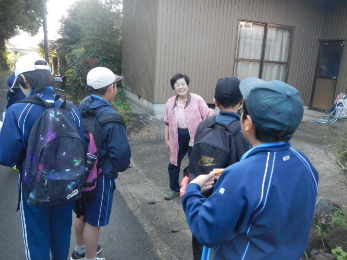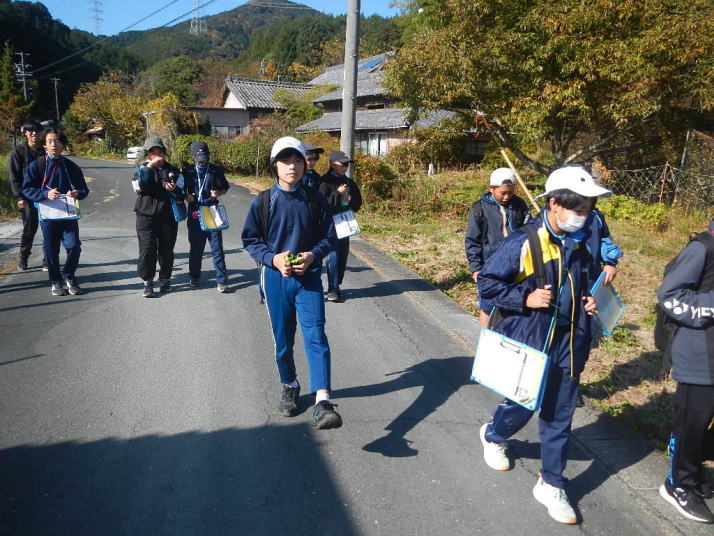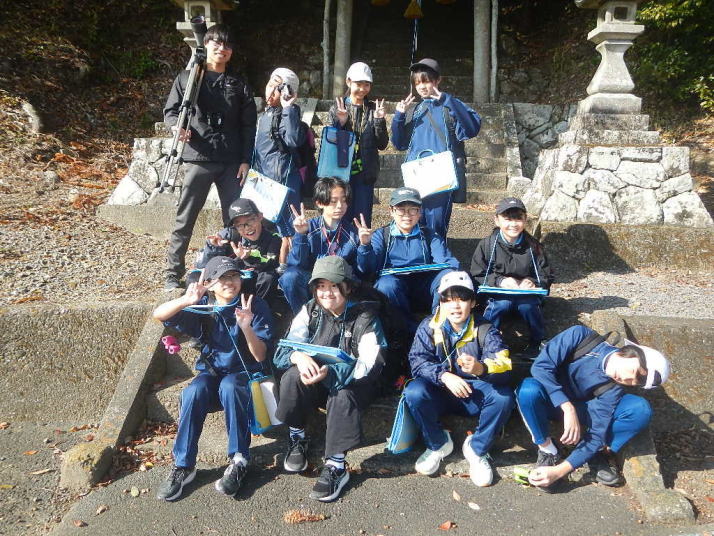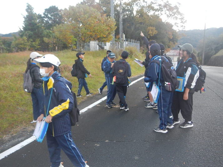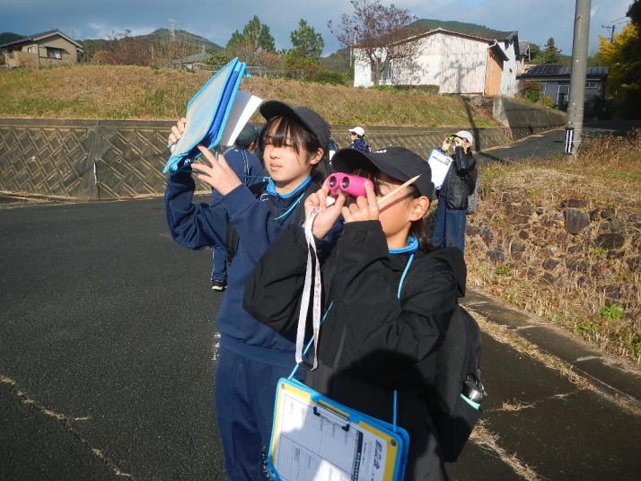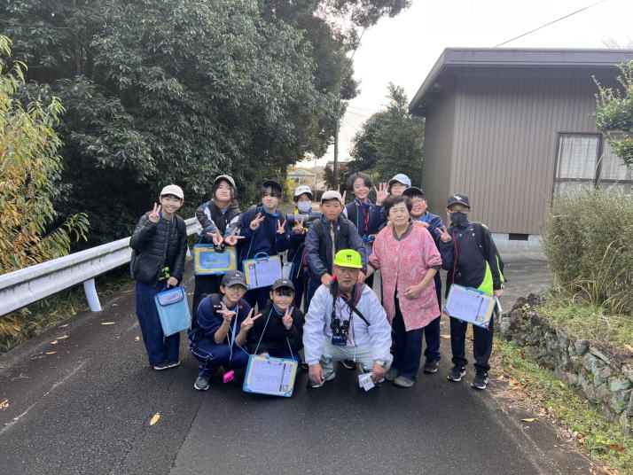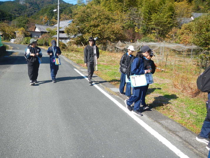 比較的暖かな中を歩いた。イソヒヨドリ、カワラヒワなどよく見る鳥とであうことができた。 集団写真には下校中の中学生もいる。萩の子の良い所。