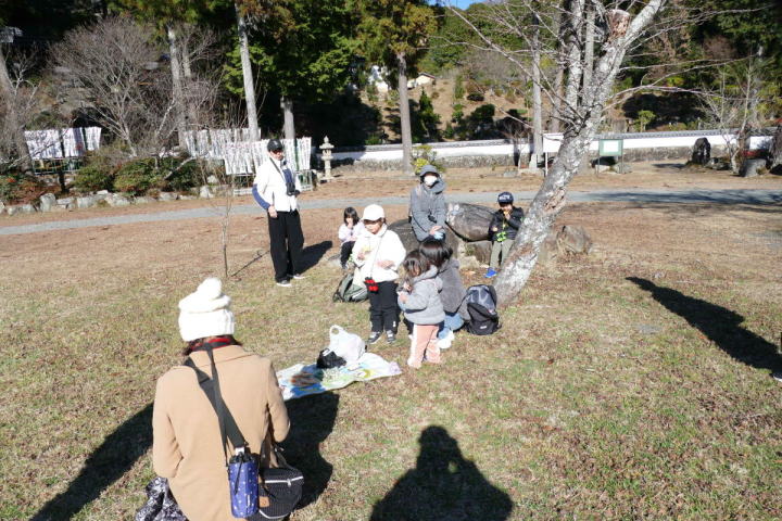 天気も参加者も少し心配していた。天気は曇とあった。日が当たらないと昼食が大変だ。7人では少し寂しい。天気の方は仕方が無いが、参加人数は、その後4名増えて11名となり安心した。萩保育園前の道は長い間通行止めとなっていた。昨年はこの道を断念した。そして今年は復活。通てみて理由がよくわかった。10メートルくらいの長さで崩れた場所が直されていたのだ。この道で沢山の鳥に出会えた。カシラダカ、アオジ、ホオジロ、ジョウビタキ、アオゲラ、ヒヨドリなど。冬鳥に出会えて満足。平尾CCの脇から自然歩道に入る。森の中を歩くので風や雨が弱まって少し安心する。日が出たり雨粒が落ちたりと実に不安定な天気だ。ただ本降りにはならなかった。心臓破りの階段にチャレンジ。1回ぐらついたことは正直に告白しよう。休むことなく280段を攻略できたことは素直に嬉しい。谷間から一気に尾根まで登り、上下しながら財賀寺に進み、最後は奥の院へと下っていく。屋根が見えてきて子どもたちも元気がでたようだ。型どおりにお参りと鐘付きを行った。そして文殊様のおられるお堂へと向かう。お参りをした後、ちょうど正午となり、副住職にお願いして、お庫裏で食事をさせていただくことにした。部屋の中では、極太筆の書、本物の花で書かれた絵、古い仏像、などを見させていただいた。昼食では、持ち寄った菓子をそれどれにあげるなどして、楽しいお弁当時間を過ごした。そして、再び山を登り、新たに萩に向かう道を、落ち婆をかき分けて下り、たどり着いたのは観音山の麓の萩の地であった。いきなり見慣れた景色が現れ驚いたことであろう。萩と財貨寺は思った以上に近いのだ。カワラヒワ、ダイサギ、ケリ、イソヒヨドリなどを見ながら小学校へと進む。次から次へと目どころがあったため、到着時間は30分の遅延となってしまう。お母さん方が車の中で待っているのを真っ先にご挨拶する。山道ばかりを歩きづめに歩いた。足も張っていることだろう。ゆっくり休んでください。(明日は祝日です)