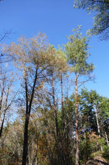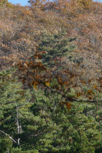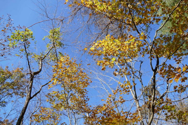 快晴。気持ちがいい。用事を済ませ室林道へと車を走らせる。室林道もさすがに秋の景色になった。ルリビタキの地鳴きが聞こえる。30年前を思い返すと、鳥を見始めた頃、家の近くで来たことのない、きれいな鳥の声が聴こえた。それがルリビタキであることを知ったのは2~3年ほど経った時であった。茶臼山や蛇峠の山で、繁殖期に入った頃、何とも不思議な節回しでさえずるルリビタキを聴いたのだった。一番聴かれたのは富士山であった。ルリビタキとメボソムシクイがうるさい程鳴いていた。いよいよ来たな。声だけでなくきれいな姿も見せてよ。そう思ってノートに名前を書き込んだ。ルリビタキC1と。