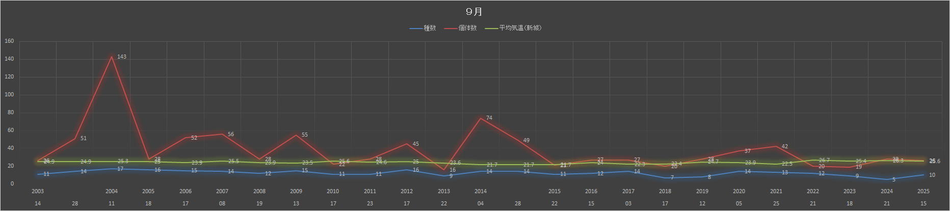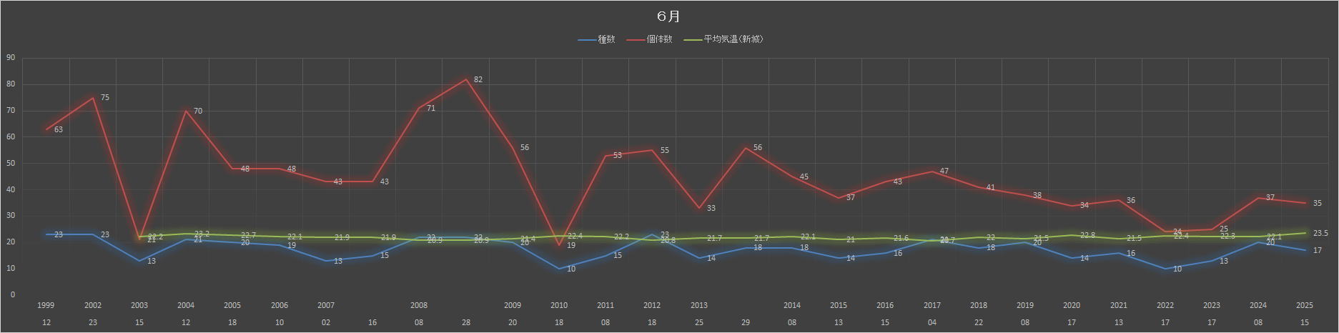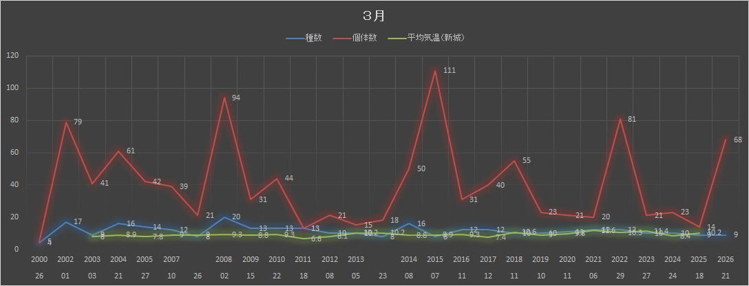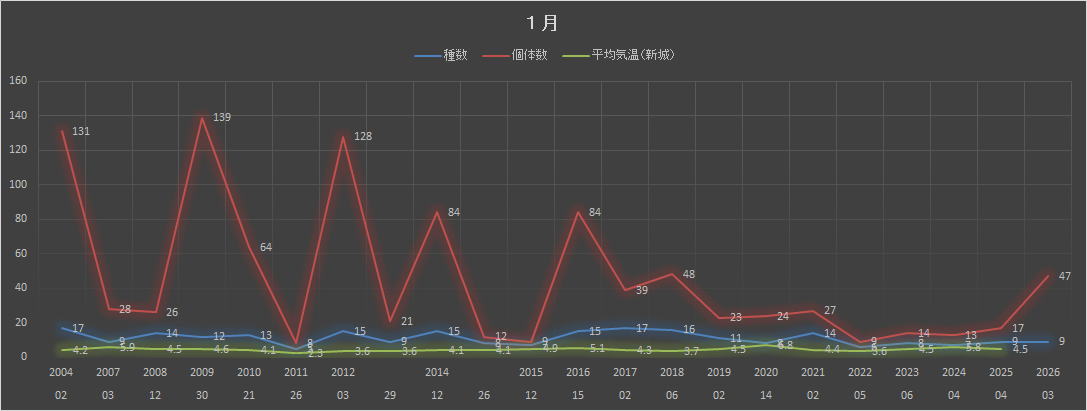 | ホオジロ | Emberiza cioides | 6 | 3 | 4 | 5 | 6 | 3 | 1 | 3 | 1 | 10 | 10 | 2 | 54 | |||||||||||||||||