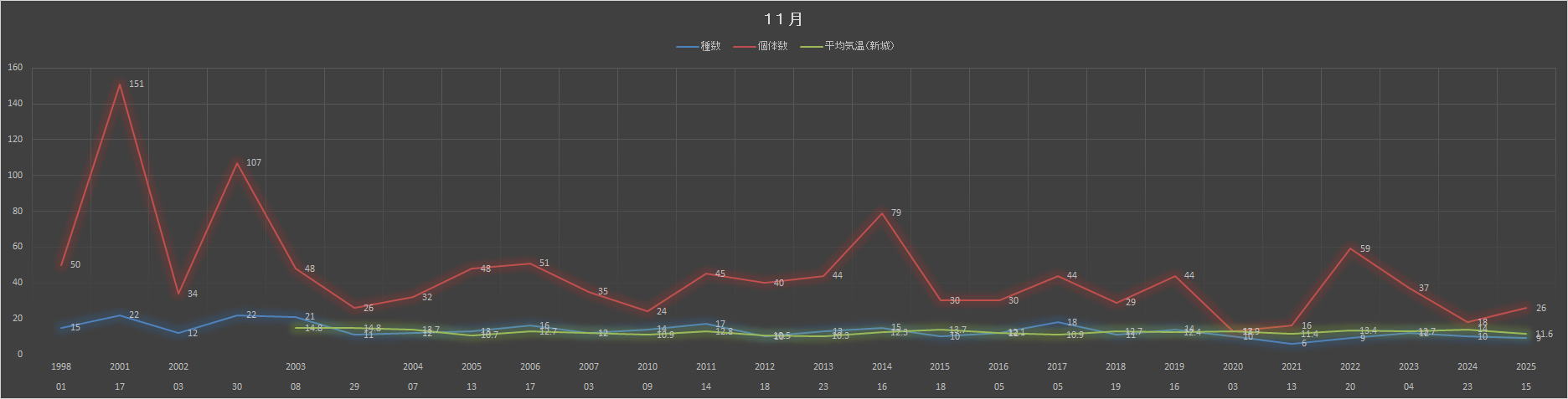 | クロジ | Emberiza variabilis | 2 | 1 | 1 | 2 | 5 | 11 | ||||||||||||||||||||||||