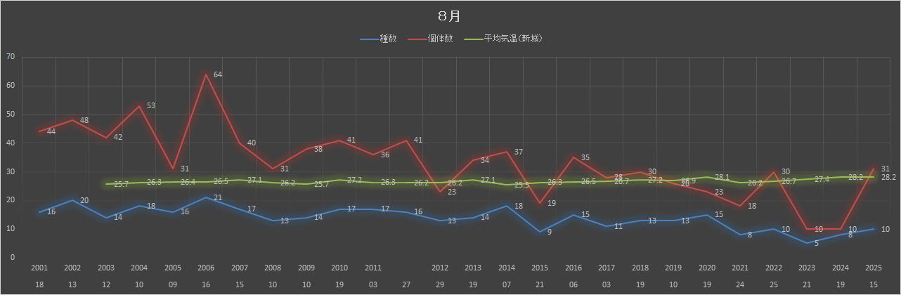 | ホオジロ | Emberiza cioides | 5 | 1 | 1 | 1 | 8 | |||||||||||||||||||||
