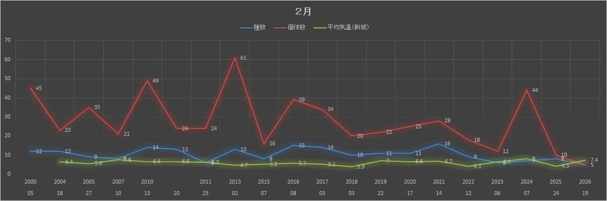 | ヒタキ | ジョウビタキ | ジョウビタキ | Phoenicurus auroreus | 2 | 1 | 1 | 1 | 2 | 2 | 1 | 10 | ||||||||||||||||||||